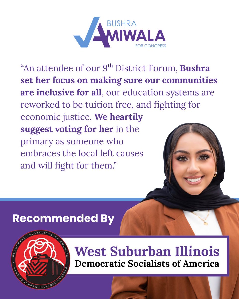 Honored to earn the recommendation of West Suburban Illinois DSA. It reflects our commitment to using democratic processes to uplift working people and the underserved, challenge corporate greed, and ensure everyone can live a full and dignified life.